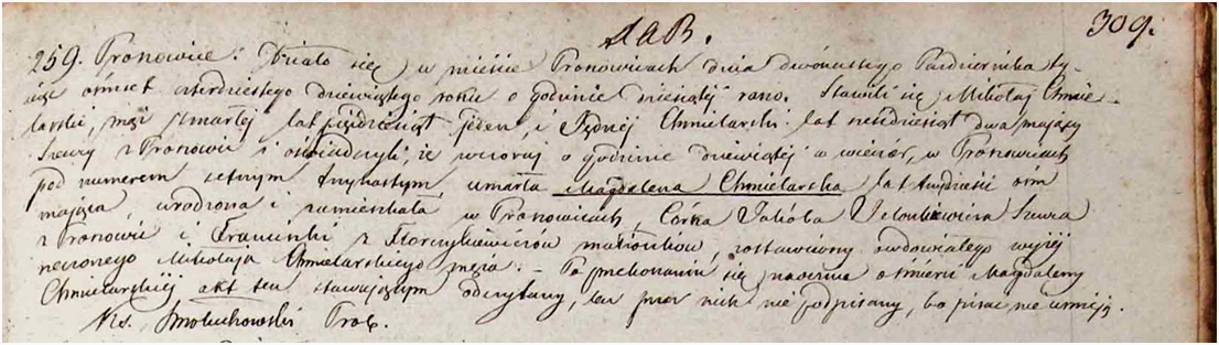 Metryka zgonu Magdaleny Chmielarskiej. Proszowice. Działo się w mieście Proszowicach dnia dwudziestego października tysiąc ośmset czterdziestego dziewiątego roku o godzinie dziesiątej rano. Stawili się Mikołaj Chmielarski, mąż zmarłej lat pięćdziesiąt jeden i Jędrzej Chmielarski lat sześćdziesiąt dwa mający, szewcy z Proszowic i oświadczyli, że wczoraj o godzinie dziewiątej w wieczór, w Proszowicach, pod numerem setnym trzynastym, umarła Magdalena Chmielarska lat trzydzieści ośm mająca, urodzona i zamieszkała w Proszowicach, córka Jakóba Jelonkiewicza szewca z Proszowic i Franciszki z Florczykiewiczów małżonków, zostawiwszy owdowiałego wyżej rzeczonego Mikołaja Chmielarskiego męża. Po przekonaniu się naocznie o śmierci Magdaleny Chmielarskiej akt ten stawującym odczytany, lecz przez nich nie podpisany, bo pisać nie umieją. X. Smoluchowski Prob.