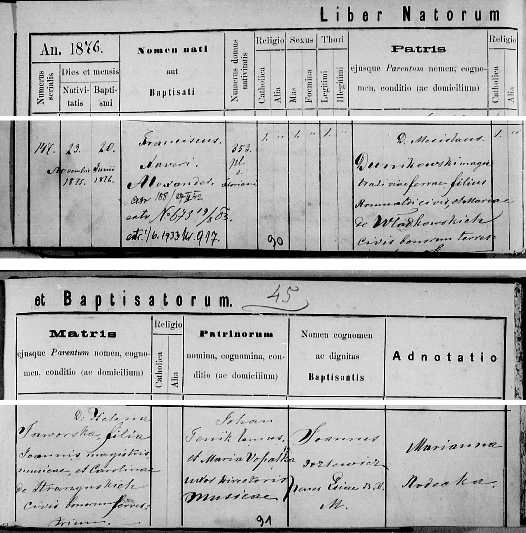 Dowód drugi: w metrykach chrztów parafii pod wezwaniem Wniebowzięcia Najświętszej Marii Panny w Krakowie (czyli kościoła Mariackiego) pod datą 20 czerwca 1876 roku odnotowano chrzest Franciszka Ksawerego Aleksandra Dunikowskiego, urodzonego w Krakowie 29 listopada 1875 roku, w mieszkaniu przy placu Św. Floriana (od 1882 roku nosi on nazwę placu Matejki) pod numerem 353. Tym samym można zakończyć dywagacje nad czasem i miejscem urodzenia późniejszego rzeźbiarza.