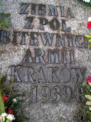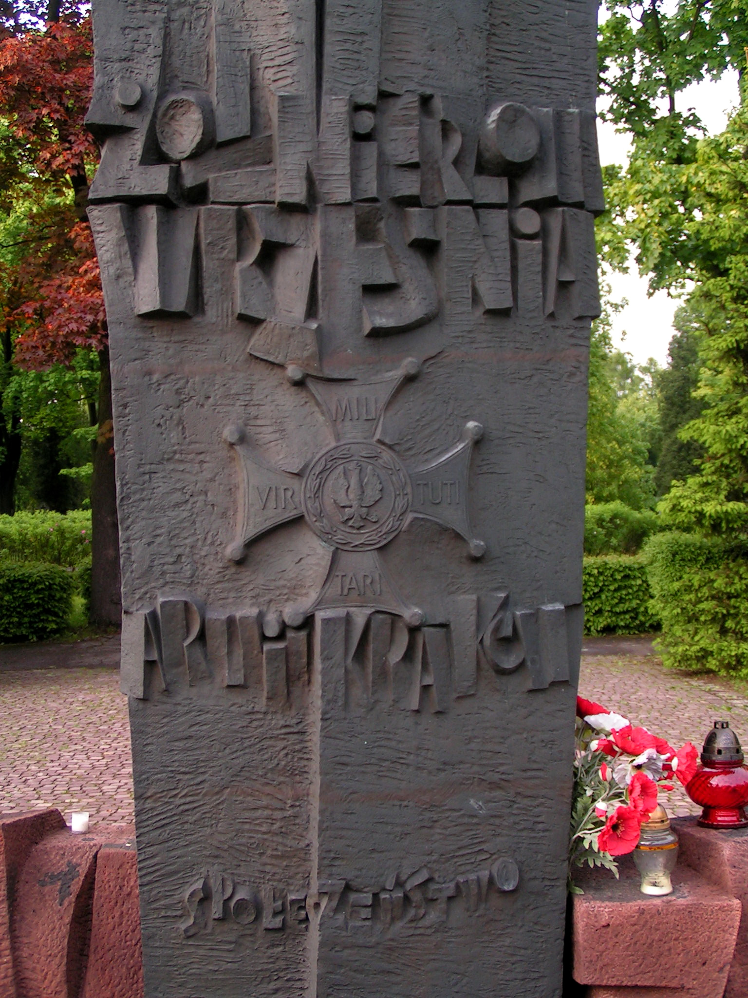 Wymowny pomnik, jest dedykowany żołnierzom września Armii Kraków, ufundowany przez społeczeństwo. Na tablicy, wśród miejscowości, znajdują się Proszowice. Umiejscowiona także ziemia, a zebrana z pól bitewnych Armii Kraków z 1939 roku (pewnie także z naszych Proszowic). Pomnik znajduje się na drugiej (nowej) części cmentarza Rakowickiego od ulicy Prandoty, w centrum nekropoli, po lewej stronie od wejścia głównego.