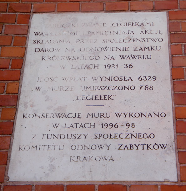Informacja na tablicy tegoż muru wawelskiego głosi, że: Tabliczki zwane cegiełkami wawelskimi upamiętniają akcję składania przez społeczeństwo darów na odnowienie zamku królewskiego na Wawelu w latach 1921-36. Ilość wpłat wynosiła 6329 w murze umieszczono 788 "cegiełek". Konserwację muru wykonano w latach 1996-98 z funduszy społecznego komitetu odnowy zabytków Krakowa.
