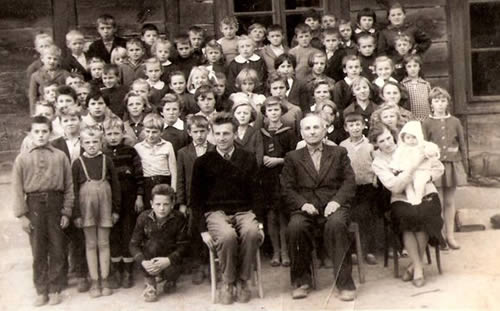 pamiątkowa fotografia uczniów i nauczycieli z 1957r, pierwszy z lewej siedzi na stołku Stanisław Świątek
