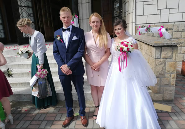 po części oficjalnej w kościele Sierosławice, Karolina z młodą parą