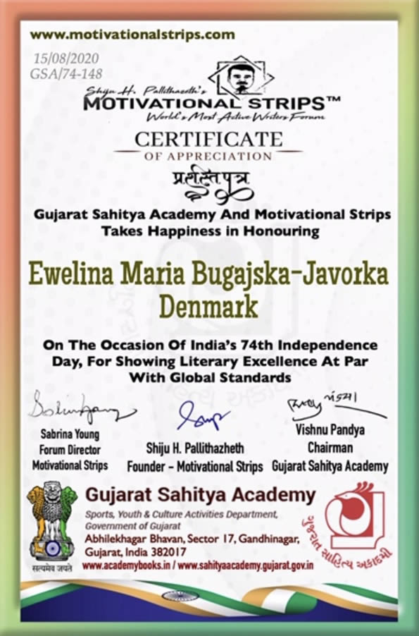 • nagroda za doskonałość literacką "Gujarat Sahitya Akademii" w Indiach i "Motivational Strips", przyznana z okazji 75 rocznicy Dnia Niepodległości Indii...
