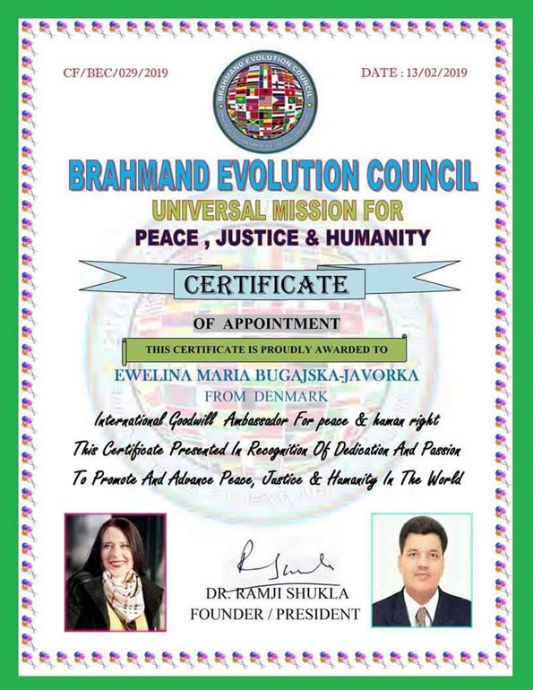 Współpracuje z ONZ i UNESCO, będąc Ambasadorem Pokoju i Praw Człowieka w Brahmand Evolution Council, jak również Ambasadorem ds. Mniejszości w FAAVM-Kanada. Jest to Federalne stowarzyszenie na Rzecz Postępu Widocznych Mniejszości z siedzibą w Kanadzie, ale działające na całym świecie.