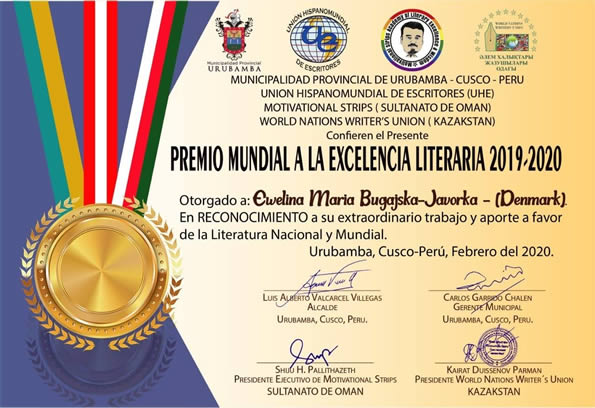 • nagroda za doskonałość literacką "Premio Mundial A La Exelencia Literaria 2019-2020", przyznana przez Rząd Republiki Peru,