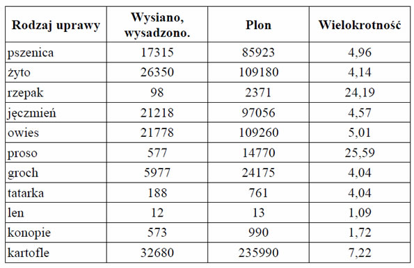 Ilość (w jednostkach zwanych czetwiertami) wysianych, zasadzonych i plon produktów rolnych w 1863 roku, przedstawia poniższa tabela.