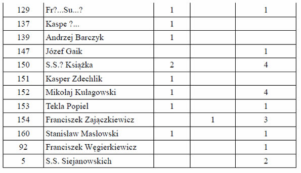 Dokument wymienia 137 domów i ich właścicieli. Spośród tych domów, pięć było zajętych przez wojsko, a jeden przez szpital powiatowy. W wymienionych domach zamieszkiwało 557 osób.