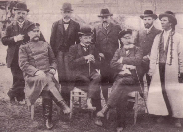 Komitet Wystawy Włościańskiej, stoją od lewej: B.Kleszczyński, W.Borzęcki, G.Godlewski, dr E.Kozieradzki, J.Tondos z Kaliny Małej, siedzą od lewej: G.I.Nowosielski - naczelnik powiatu miechowskiego, F.Zdziechowski, komisarz Zajączenko