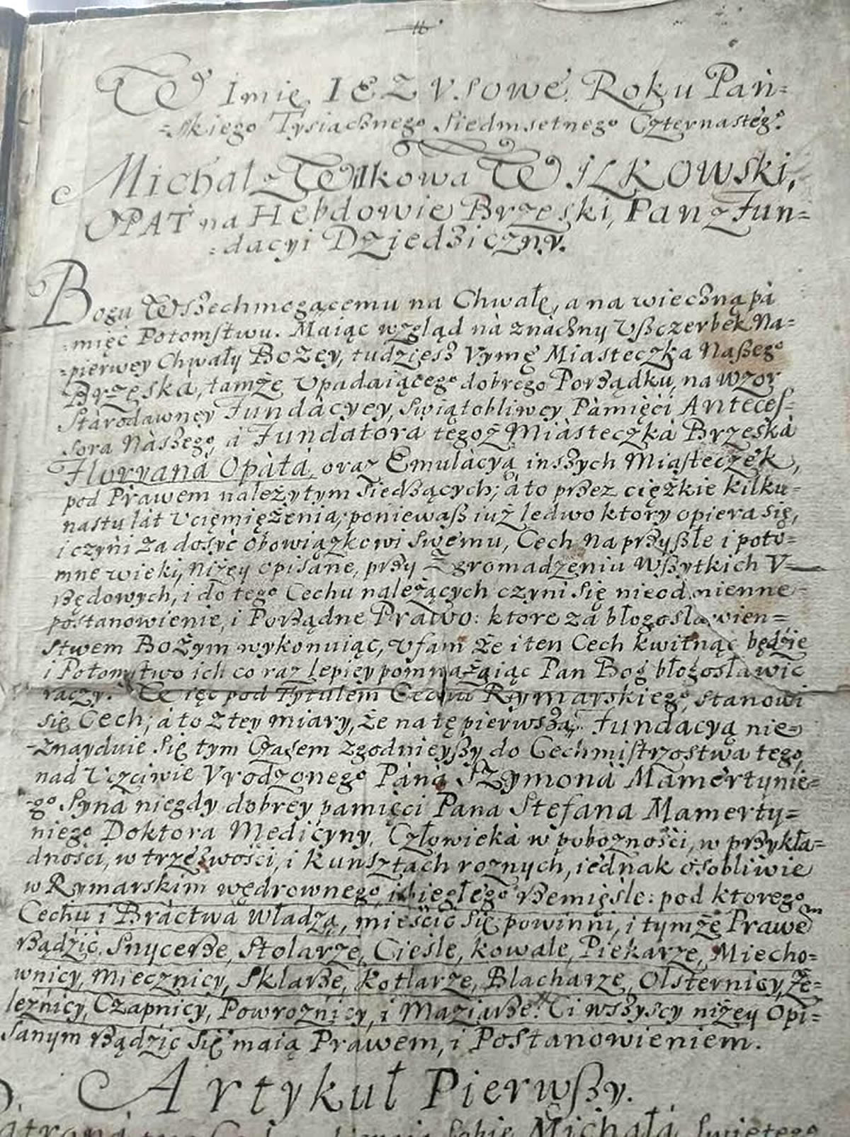 Bogu Wszechmogącemu na Chwałę, a na wieczną pamięć potomstwu. Mając wzgląd na znaczny uszczerbek najpierwej Chwały Bożej, tudzież [...] Miasteczka Naszego Brzeska, tamże upadającego [...] na wzór starodawnej fundacji [...] Floryana Opata [...] a to przez ciężkie kilkunastu lat uciemiężenia [...] cech na przyszłe i potomne wieki [...] czyni się nieodmienne postanowienie i porządne prawo, które za błogosławieństwem Bożym wykonując, iż ten cech kwitnąć będzie [...]