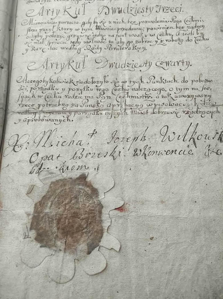 Tym cenniejszy jest prezentowany "Przywilej nadany Zgromadzeniu Spółeckiego z 1714 roku" nadany przez Opata Michała z Wilkowa Wilkowskiego. Liczy 27 artykułów i opatrzony jest podpisem i pieczęcią Opata Jest to skromny dokument, ale bardzo ważny w kontekście rzemiosła w Nowym Brzesku którego Norbertanie byli założycielami i właścicielami.