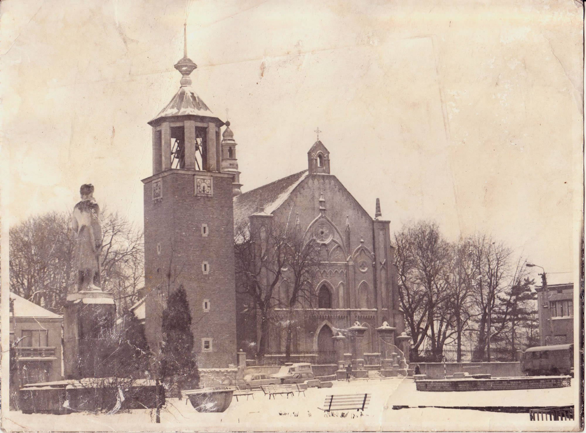 Przy pierwszym filarze bramy szybkim krokiem podąża kobieta w kożuchu, ciekawe czy spieszy się do kościoła, czy na spotkanie z drugą osobą, która czeka odwrócona plecami do fotografa? Jest duży fiat 125p, a wartę honorową pełnią dwa "maluchy" - fiaty 126p. Jest nawet rumuńskie auto terenowe "aro" z szoferem, siedzi w środku. Będzie miało za chwilę sprawdzian techniczny na zaśnieżonych i oblodzonych drogach miejsko-wiejskich.