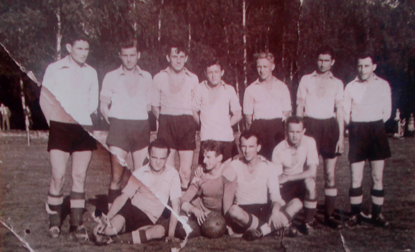 16 czerwca 1954, mecz ze Spójnią Kraków 6:0, zdjęcie na boisku Proszowianki; stoją od lewej: Zdzisław Zastawny, Stanisław Sadowski, Doniec Jacek, Jerzy Jurek, Kazimierz Stopiński, Ryszard Gawron, Zdzisław Winnicki; w dolnym rzędzie od lewej: Marian Dziura, Jerzy Steckiw, Wincenty Jelonkiewicz, Zbigniew Kawula (fot. zbiory autora)