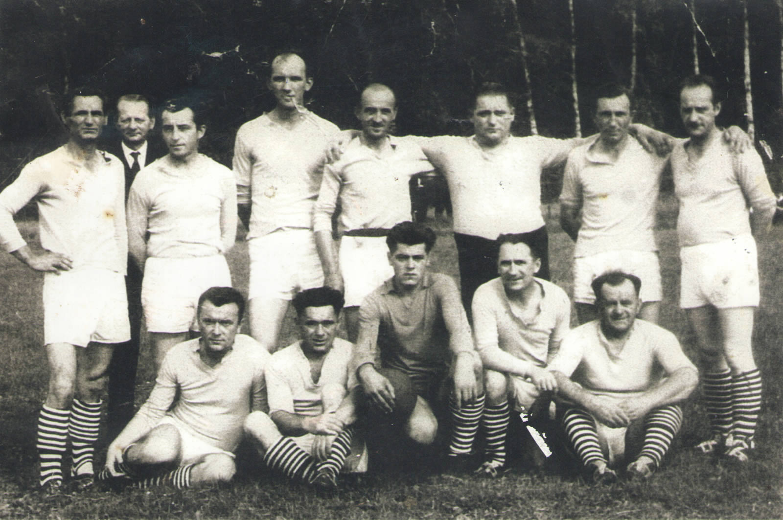 oldboje Proszowianki zdjęcie zrobione ok. 1960 roku; stoją od lewej: Zdzisław Zastawny "Poldek", Bolesław Wcisło, Zdzisław Winnicki, Wojciech Jelonkiewicz, Kazimierz Stopiński, Henryk Moliszewski, Tadeusz Sadowski, Dziura Marian; w dolnym rzędzie od lewej: Wincenty Jelonkiewicz, Feliks Skalski, Mieczysław Skrzyński, Jan Żywot, Andrzej Monsiorski, Bolesław Wcisło (fot. zbiory autora)