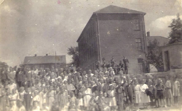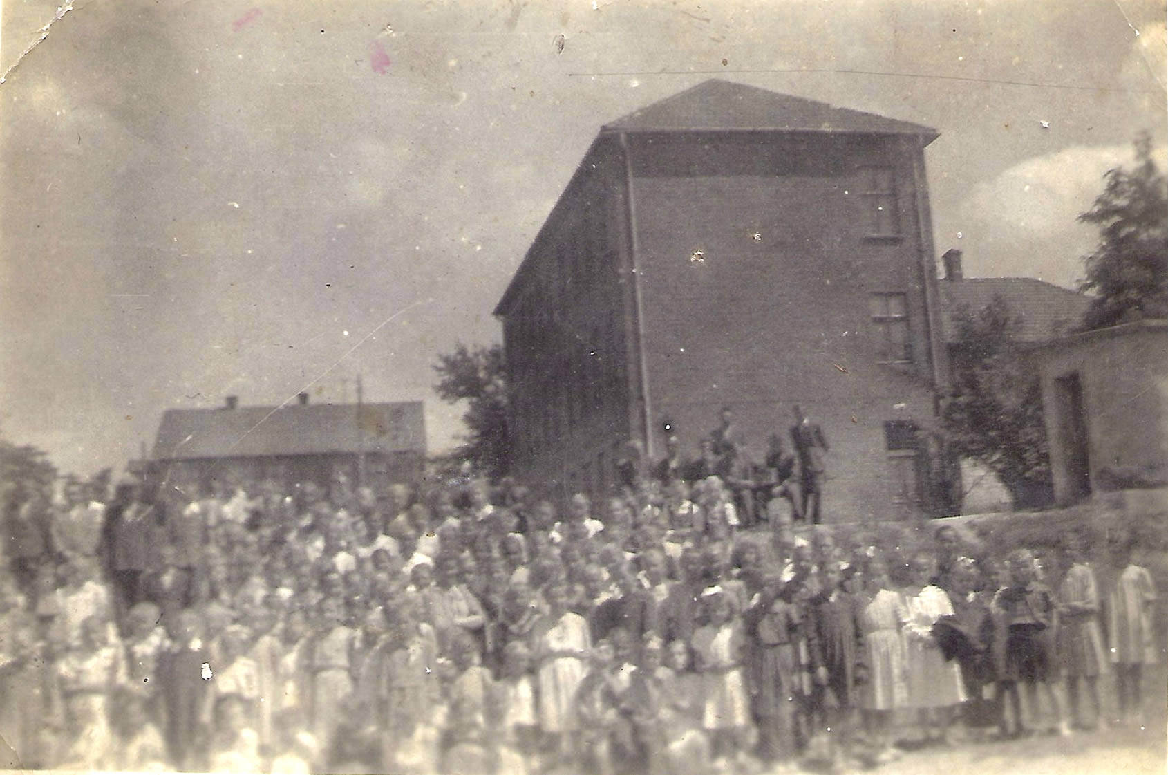Koniusza uroczystość szkolna, na zdjęciu widoczny jest budynek szkoły, na tamte lata bardzo nowoczesny, druga połowa lat pięćdziesiątych XX w. (fot. zbiory Stanisława Palucha)
