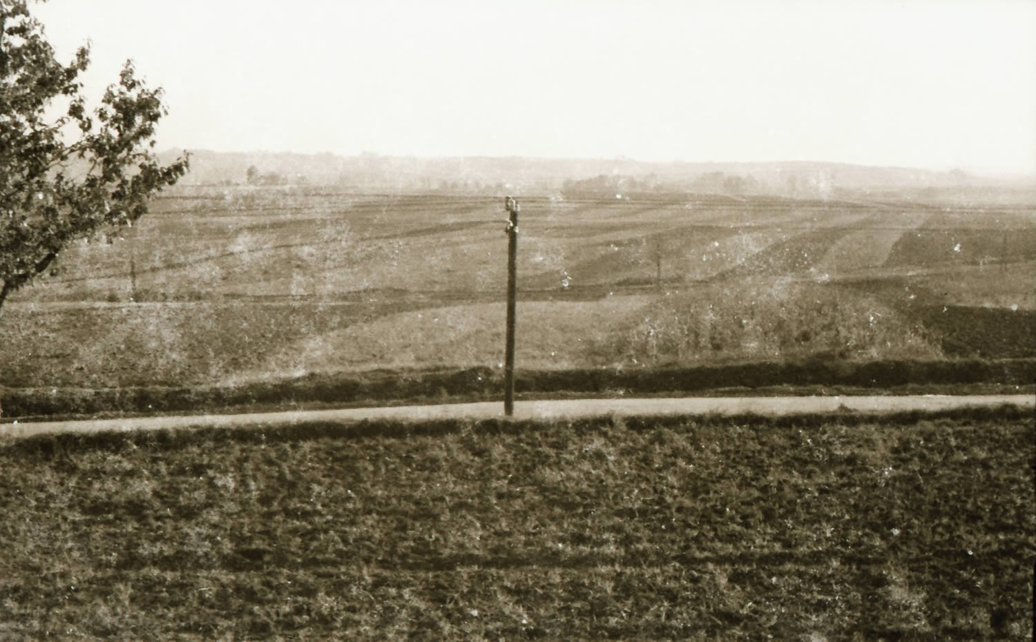 widok z kurhanu "Boża Męka" na kawałek ówczesnej szosy Proszowice - Kraków, w perspektywie widoczne pola w kierunku Łaganowa i Żębocina (fot. zbiory Stanisława Palucha)