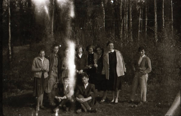 świąteczny wypad do lasu w Koniuszy, na zdjęciu od prawej kol. Marysia Sowa, Teresa Wleciał, nazwisk dwóch kolejnych nie kojarzę, piąta z prawej Ania Nowak, dalej kol. Halina Klepacka, Alicja Witulska, nazwisko ostatniej z lewej strony kol. uciekło z pamięci, na pierwszym planie siedzą od lewej Stanisław Paluch i Marian Wątek (fot. zbiory Stanisława Palucha)