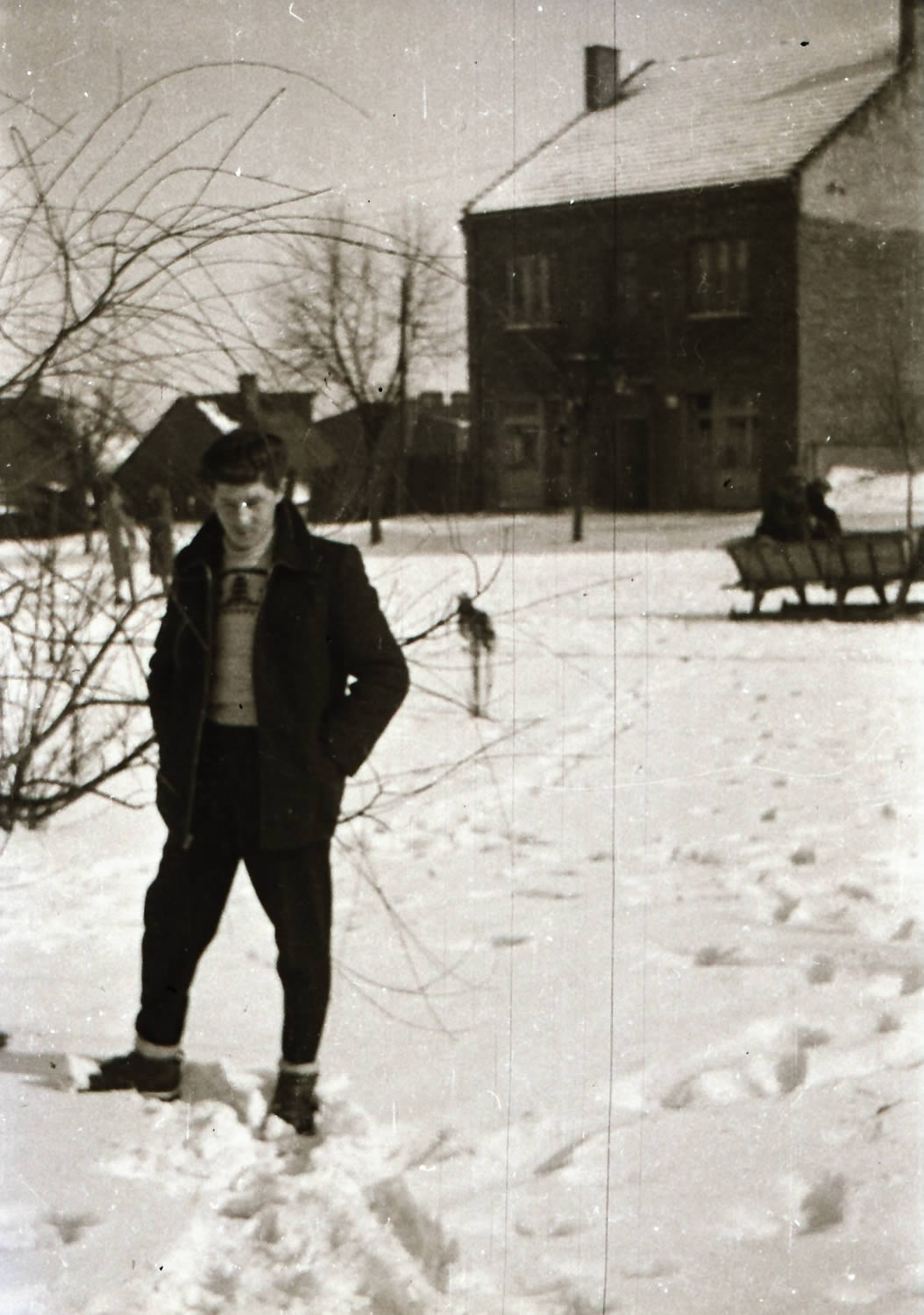 sceneria zimowa na rynku w Proszowicach, na pierwszym planie Ja, w tle sanki, w perspektywie po wschodniej stronie piętrowy budynek państwa Paluchów (fot. zbiory Stanisława Palucha)