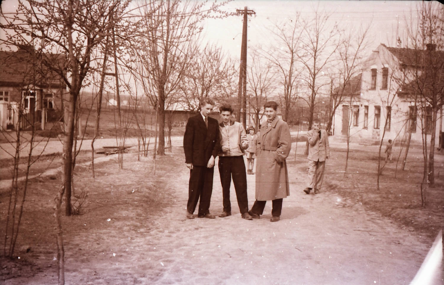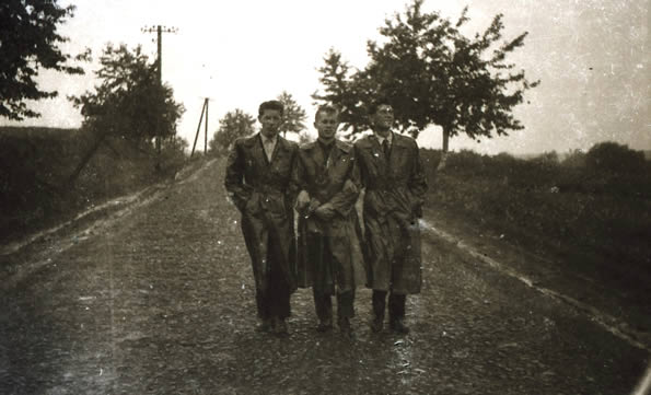 Jazdowiczki, droga na Słomniki, trzech nierozłącznych przyjaciół, od lewej Ja, Jasiu Pawłowski i Boguś Zastawny, z tej trójki pozostałem sam, dziś ten odcinek drogi jest obudowany domami (fot. zbiory Stanisława Palucha)