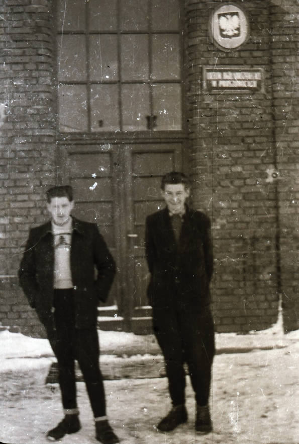 wejście do naszego Liceum Ogólnokształcącego w Proszowicach, na zdjęciu kol. Stasiu Margul i Ja (fot. zbiory Stanisława Palucha)