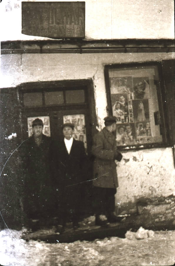 witryna i wejście do Zakładu Fotograficznego pana Wtorka przy ul. Głowackiego w Proszowicach, na zdjęciu od lewej Ja, Stasiu Cichy i Jasiu Pawłowski (fot. zbiory Stanisława Palucha)