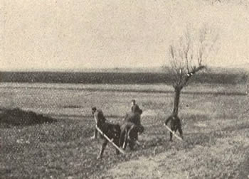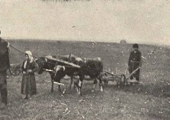 Roboty polne w okolicy Proszowic. W braku koni krowy zaprzężone do pługa.