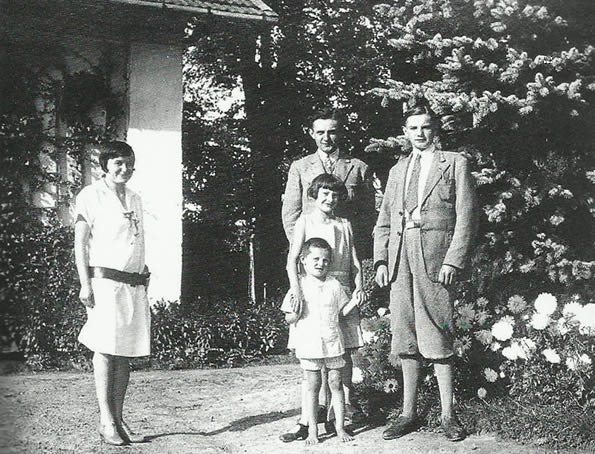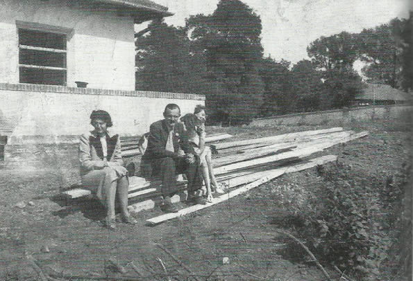 Leon z żoną Krystyną i siostrą Zofią na pagórku, koniec lat 30-tych, zdjęcie wykonane od południowej strony budynku, w prawym rogu widoczne stodoły dworskie (fot. "Małe Ojczyzny - Odonów")