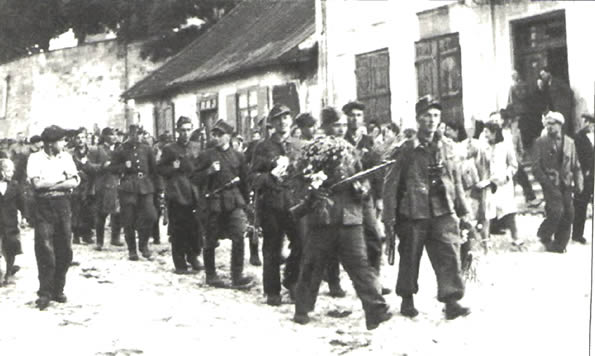 oddział partyzancki BCh im. B. Głowackiego pod dowództwem ppor. Tomasza Adrianowicza "Pazura" wkracza na rynek w Działoszycach na czele kolumny jeńców niemieckich ze zdobytego Stutzpunktu 26 lipca 1944 r. W pierwszej dwójce Józef Baca "Blondyn", obok z kwiatami radziecki por. "Szpak"; druga dwójka: N N i NN; między głowami drugiej dwójki głowa Aleksandra Niteckiego "Zmudzina"; w trzeciej dwójce Stefan Miechówka "Listek"; w czwartej dwójce N. Wróblewski "Świerk", (autor: Witold Woźniakowski z Działoszyc)