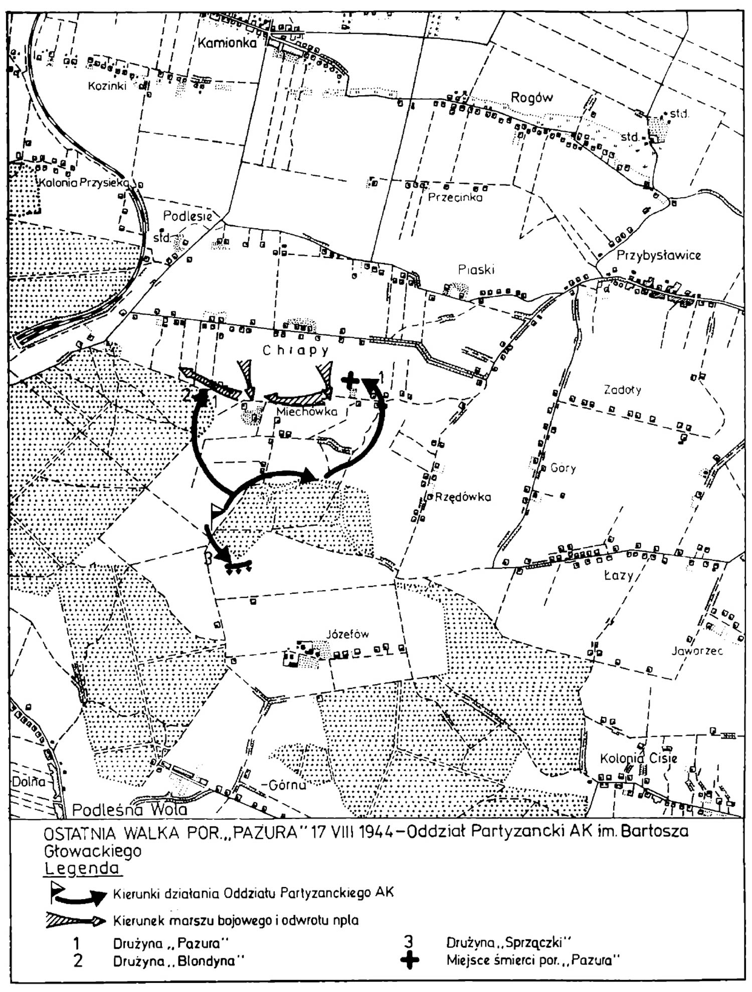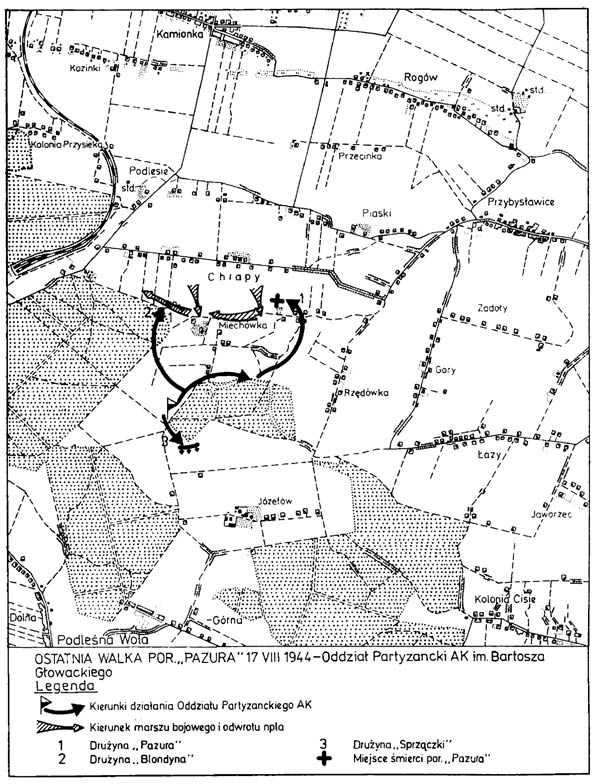 Po pewnym czasie wrócił "Pazur" wraz z pozostałymi ludźmi, kazał sprawdzić, czy wszyscy są, i wydał rozkaz do marszu, z obowiązkiem popychania przeładowanych wozów, jeśli zajdzie tego potrzeba. Ja z drużyną zostałem na pewną odległość, mając zadanie ubezpieczenia wycofującego się oddziału przed ewentualnym pościgiem.