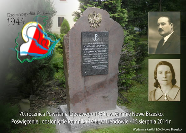 pomnik i tablica ufundowane ze środków własnych Społecznego Komitetu Miejsko-Gminnego ds. Obchodów 70. Rocznicy Rzeczpospolitej Partyzanckiej 1944 i Powstania Lipcowego w Gminie Nowe Brzesko [okolicznościowa kartka] (fot. zbiory autorki)