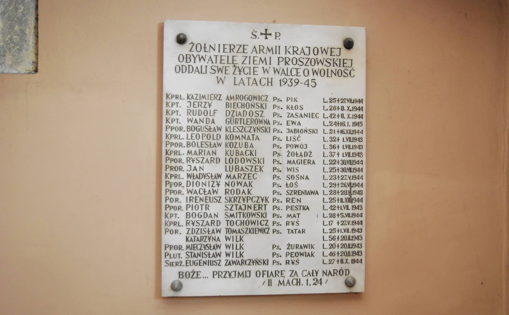 Na tablicy umieszczone są symbolicznie tylko 22 nazwiska z wielu osób Ziemi Proszowskiej, które oddały swe życie walcząc o wolność i niepodległość Polski w latach 1939-1945.