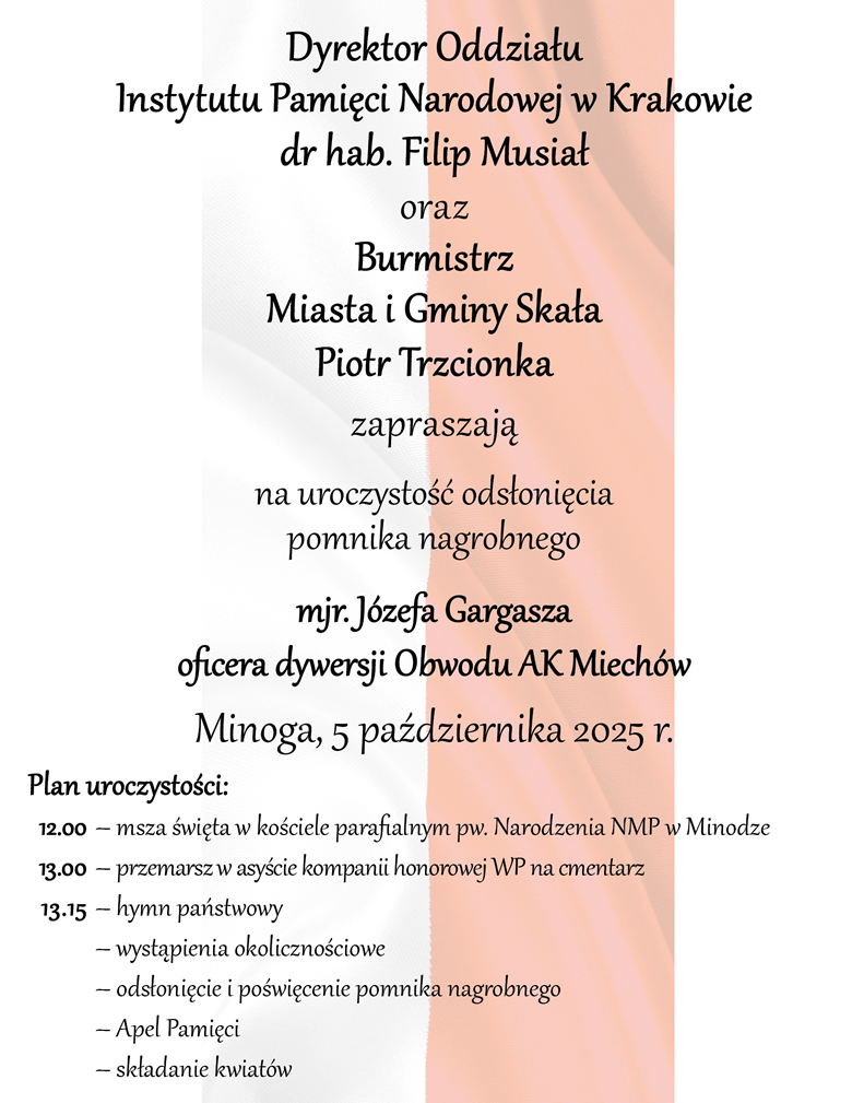W niedzielę, 5 października o godzinie 12.00 od mszy świętej w kościele parafialnym pw. Narodzenia NMP w Minodze rozpoczną się uroczystości związane z odsłonięciem pomnika nagrobnego mjr. Józefa Gargasza ps. Grot.