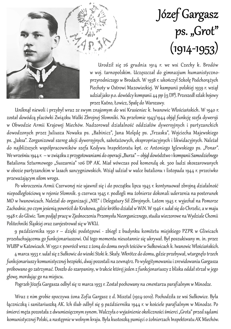 Mjr Józef Gargasz to żołnierz wrześniowej wojny obronnej w 1939 roku, oficer dywersji Obwodu Armii Krajowej Miechów, dowódca 1 kompanii Samodzielnego Batalionu Szturmowego "Suszarnia" 106 Dywizji Piechoty AK. Został zamordowany przez komunistyczny Urząd Bezpieczeństwa 4 marca 1953 r.