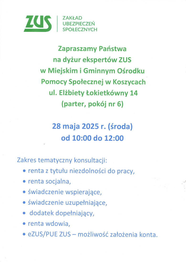 W środę, 28 maja od godziny od 10.00 do 12.00 w koszyckim Miejskim i Gminnym Ośrodku Pomocy Społecznej odbędą się konsultacje z pracownikami ZUS dla mieszkańców Miasto i Gmina Koszyce.