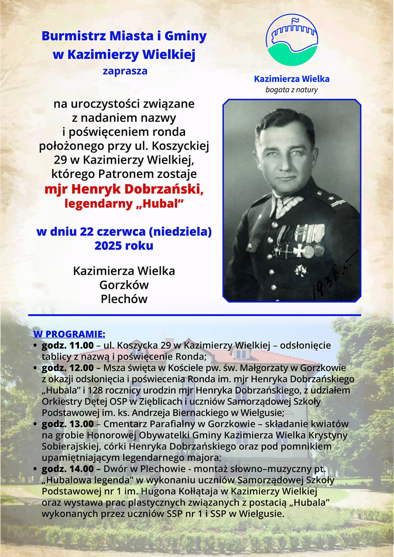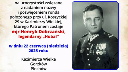 W niedzielę, 22 czerwca od godziny 11.00 w Kazimierzy Wielkiej rozpoczną się uroczystości związane z nadaniem nazwy ronda im. mjr. Henryka Dobrzańskiego ps. Hubal.